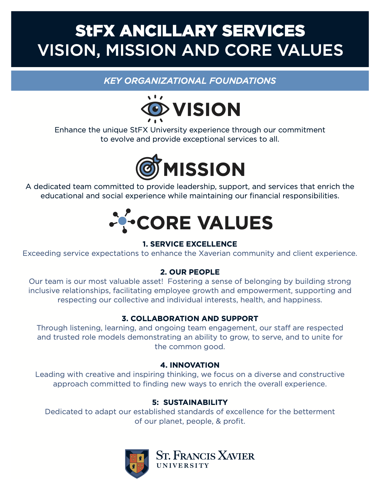 The Ancillary Services team operates and coordinates a wide range of vital campus services from housing and food services to summer accommodations, events & conference services. The breadth and quality of the services we offer allow us to touch the lives of students, faculty, staff, and the community of Antigonish and the surrounding area. Review our Vision, Mission, and Core Values.