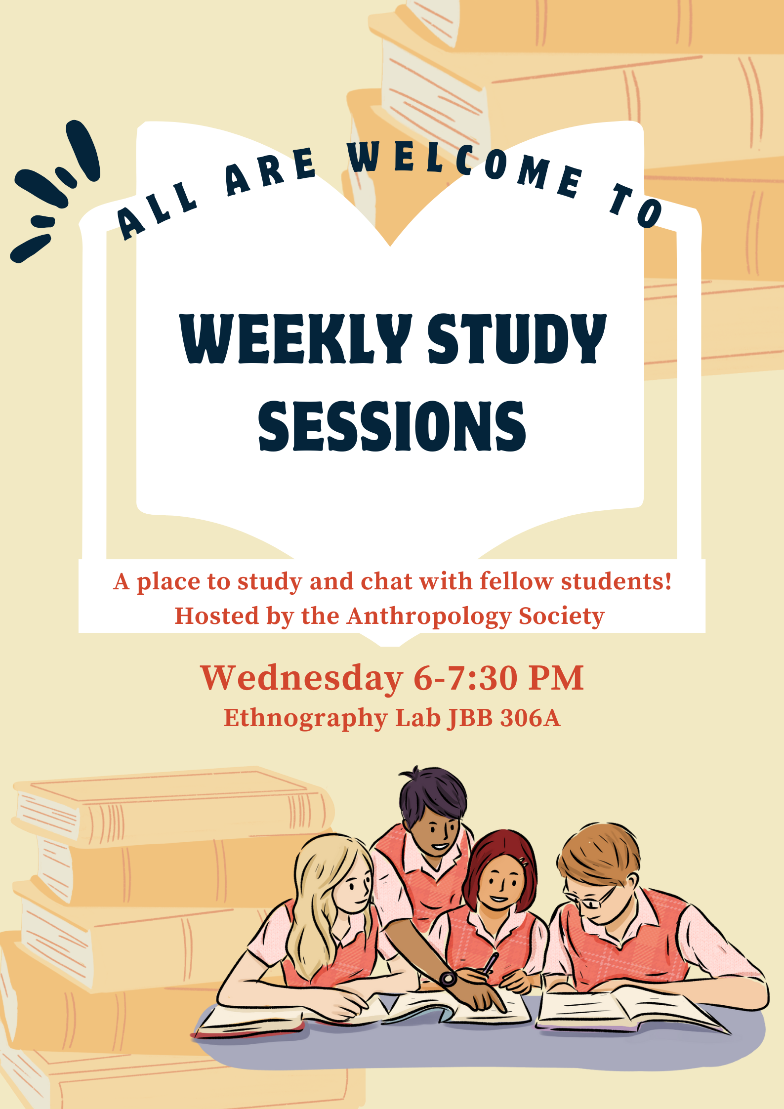 All are welcome to attend Weekly Study Sessions hosted by the Anthropology Society. A place to study and chat with fellow students! Join us Wednesdays from 6-7:30pm in the Ethnography Lab (JBB 306A)!
