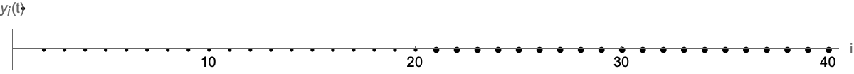 Section 4.2.3 of lecture notes: Time evolution of 40 mismatched coupled oscillators when only the first oscillator is initially displaced