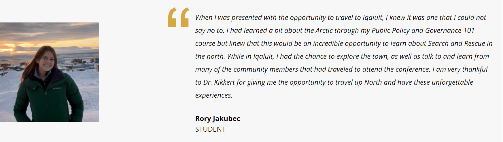 In recent years, students have travelled with their professor on research trips to Yellowknife in the Northwest Territories and to Iqaluit, Cambridge Bay, Kugluktuk, Taloyoak, and Gjoa Haven in Nunavut. While being taught how to conduct respectful and effective community-collaborative policy research, students were able to explore Northern communities and travel on the region’s waters, land, and ice.