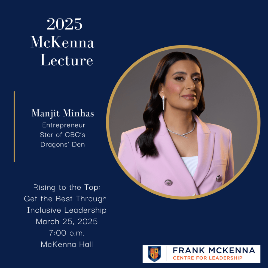 The Frank McKenna Centre for Leadership is pleased to announce that Manjit Minhas, star of Dragons' Den, will deliver the 2025 McKenna Lecture on March 25, 2025, at 7:00 p.m. in McKenna Hall. In this Lecture, entitled “Rising to the Top: Get the Best Through Inclusive Leadership” Manjit asks how can we truly rise up to the occasions that challenge us? How can we harness exciting possibilities in a way that inspires others? How can we ensure everyone under our leadership has what they need to thrive?