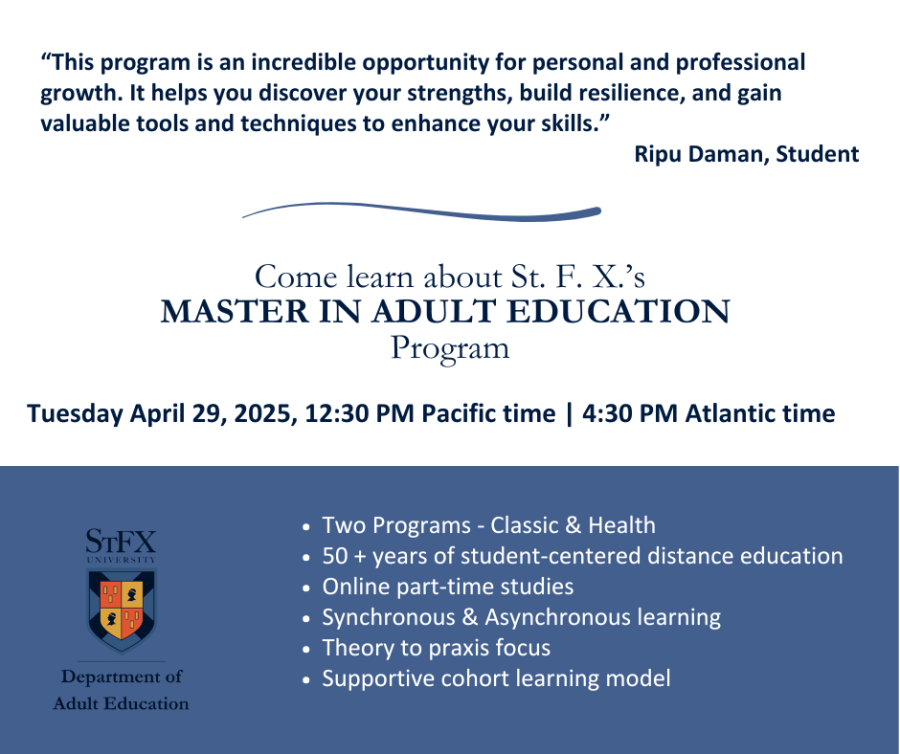 Come learn about St. F. X.’s MASTER IN ADULT EDUCATION Program