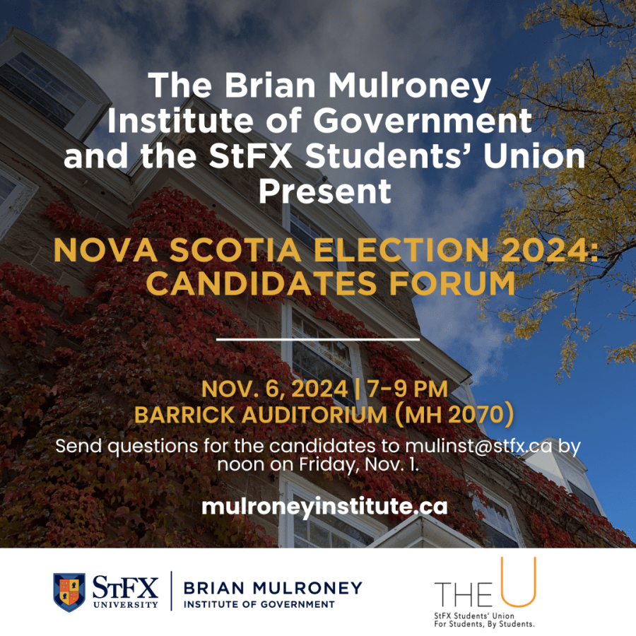 The Brian Mulroney Institute of Government and the StFX Students’ Union will be hosting a forum for candidates running in the provincial election for the riding of Antigonish. All students and members of the campus and Antigonish community are welcome to attend to learn more about the candidates’ platforms.