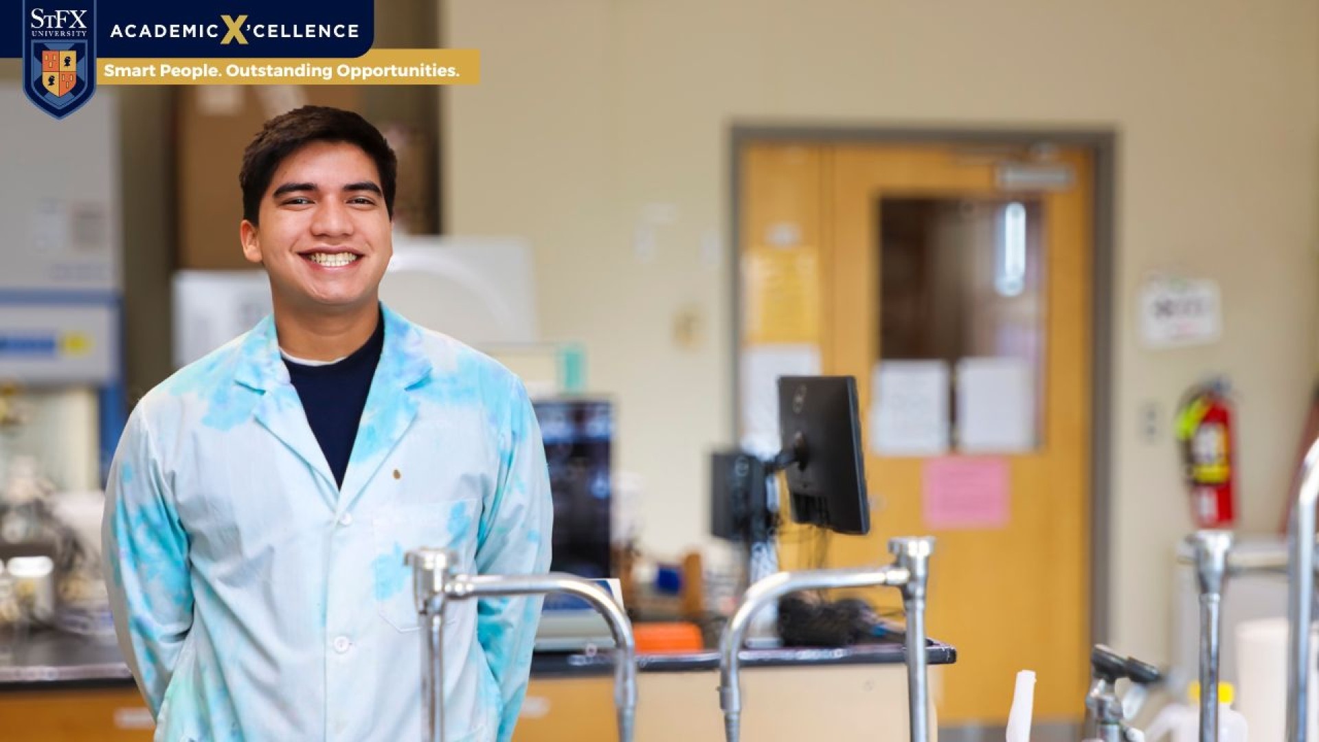 Here we meet Victor Martinez-Macias, a fourth year chemistry student from Portoviejo, Ecuador, who is already making an impact. So far in his undergraduate degree, Victor has received both a John P. Cunningham Internship and Scotia Scholar Undergraduate Research Award and has spent the last two summers conducting research under the supervision of StFX faculty mentors. Victor attended the 2024 ChemCon Chemistry Conference where he participated in a student panel and won the Best Undergraduate Poster Presentation. He is also a student leader, serving as a senior community advisor in residence and co-president of the Chemistry Society.