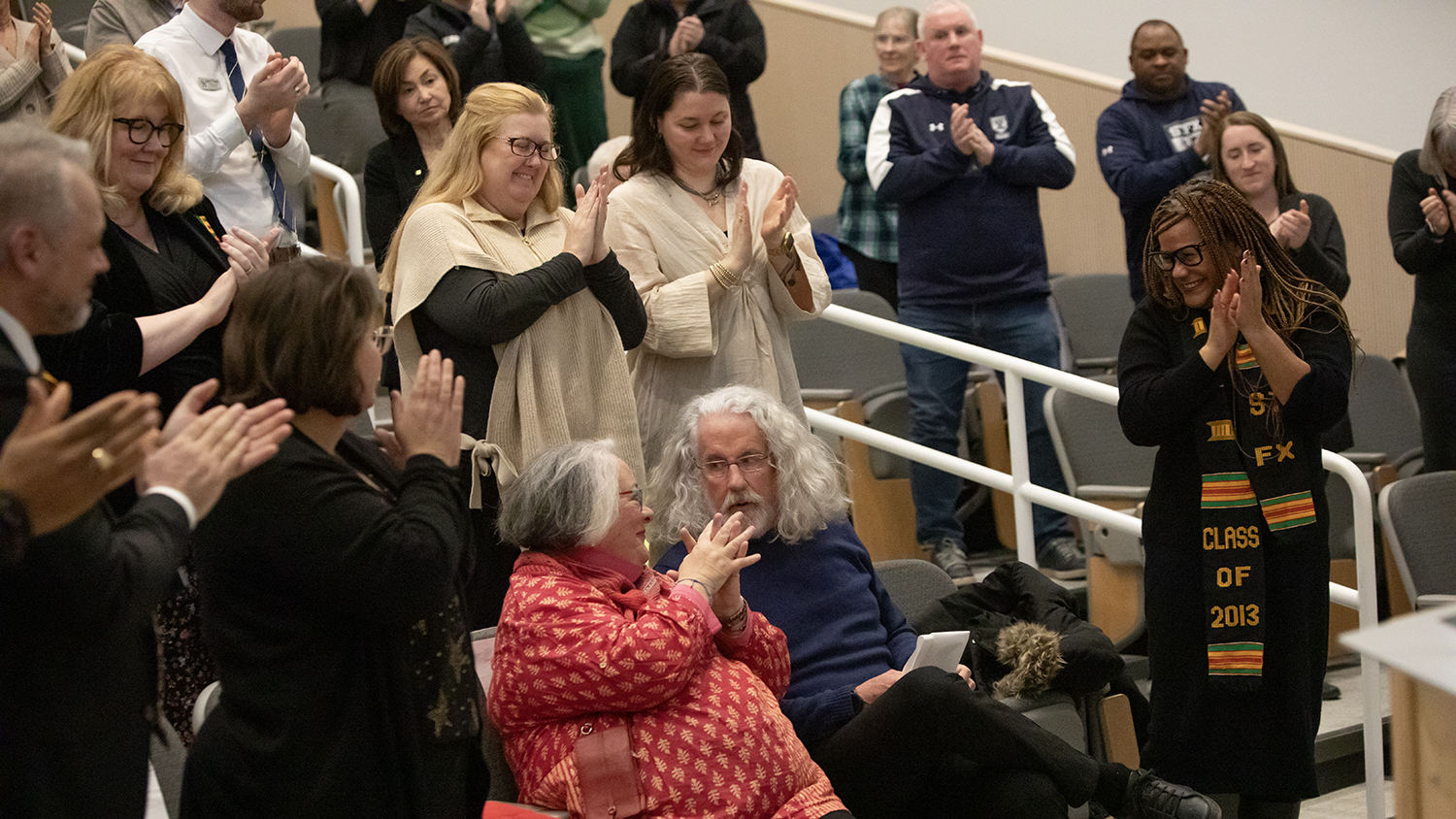 Dr. Jonathan Hood, sport management professor in StFX’s Gerald Schwartz School of Business and a member of the StFX Class of 2008, served as the ceremony host. “We are here today to celebrate, once again, a Xaverian whose multi-million dollar gift to the university in 2015 has already changed countless lives,” he said before introducing a video that offered a broader picture of the person Ms. Deveau was, including her tenacity and generosity.