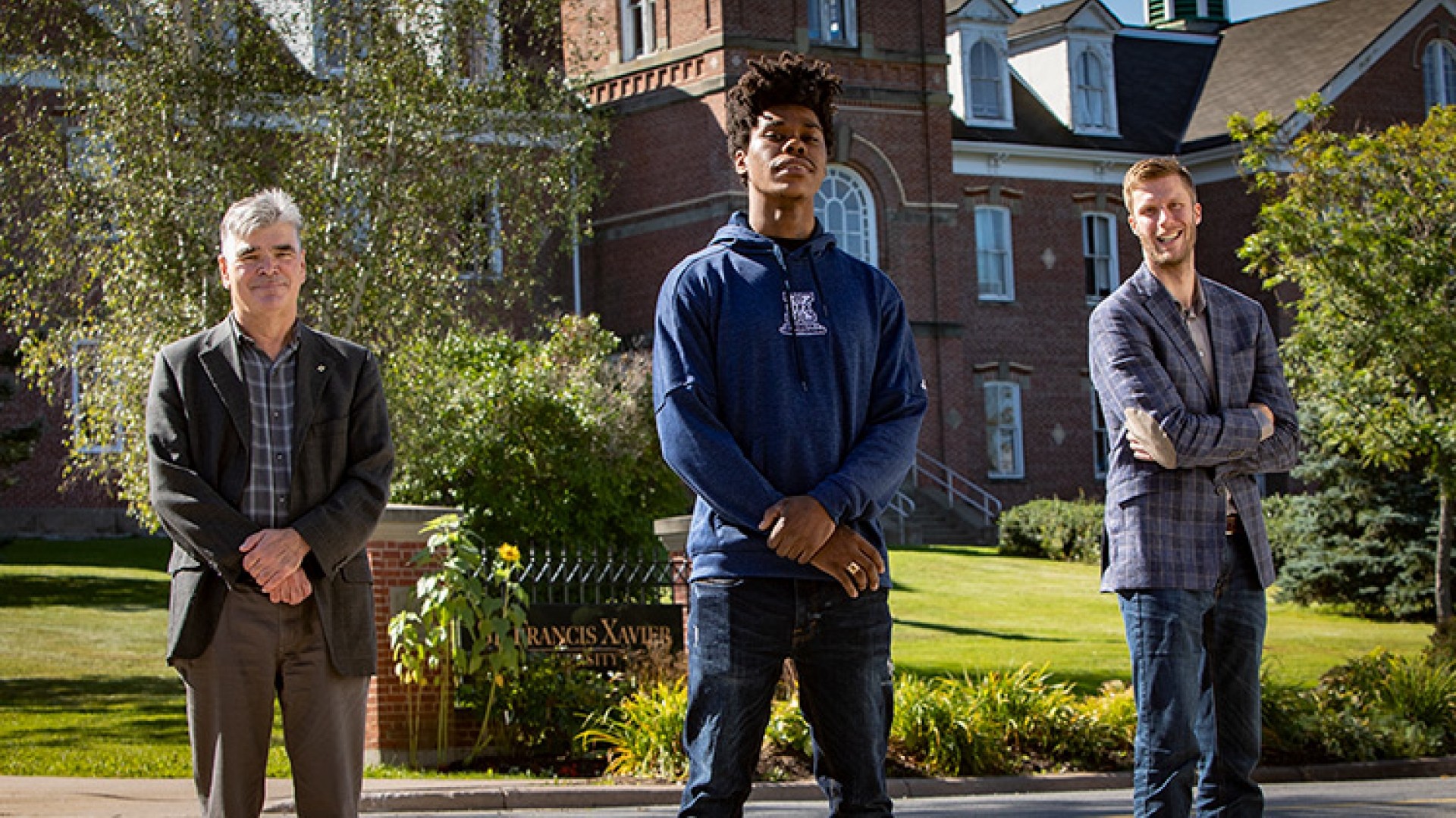 StFX student Mbongeni Ndlovu (centre), recipient of a MITACS Accelerate Entrepreneur award, is pictured with Andrew Kendall, StFX’s Manager of Industry Liaison and Technology Transfer (left) and computer sciences professor Dr. James Hughes.