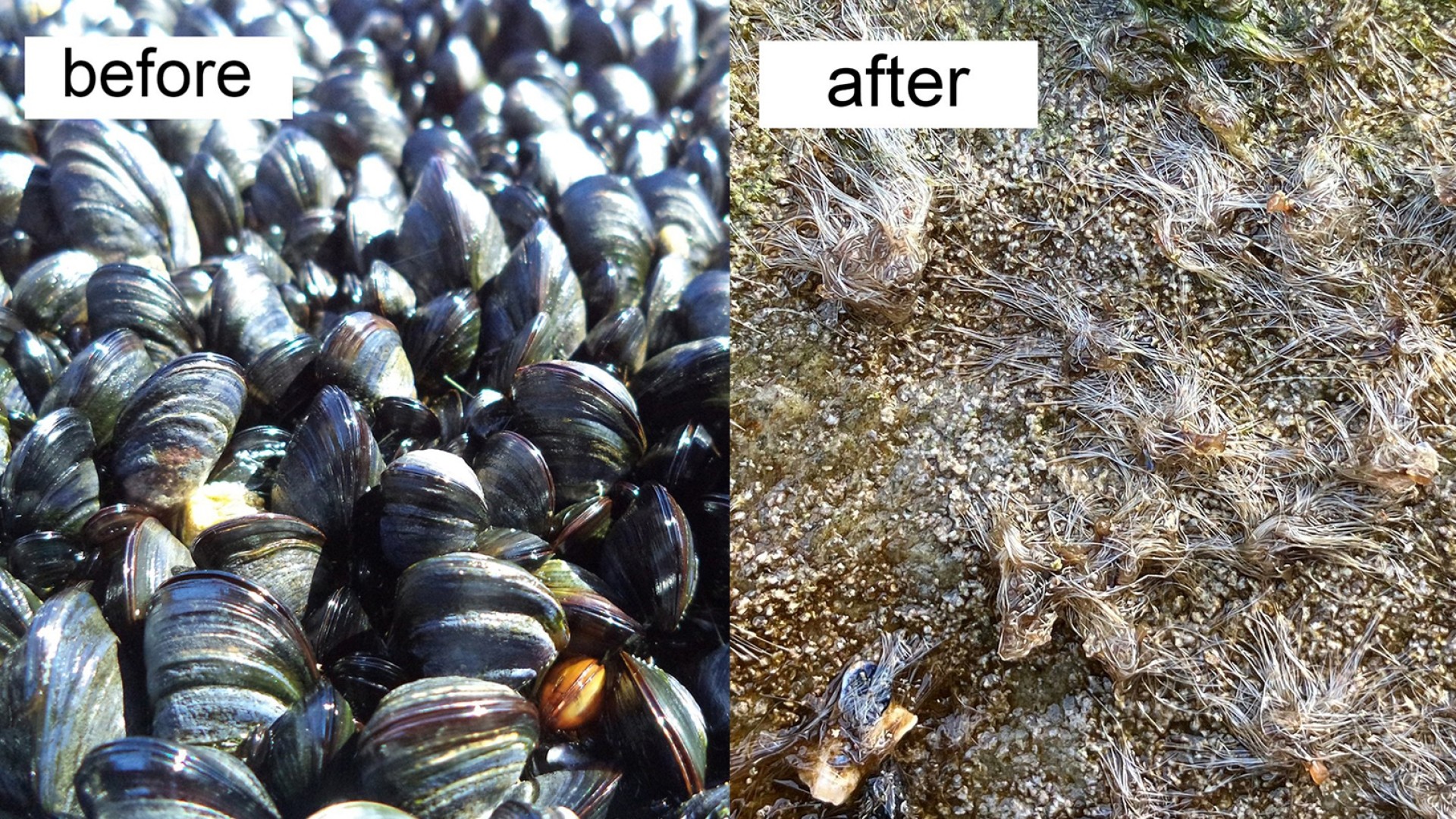 Above, the left photo shows how intertidal mussel beds looked before February 2023, while the right photo (taken in April 2023) shows byssal threads still attached to the rocky substrate, the only sign that mussel beds ever existed there.