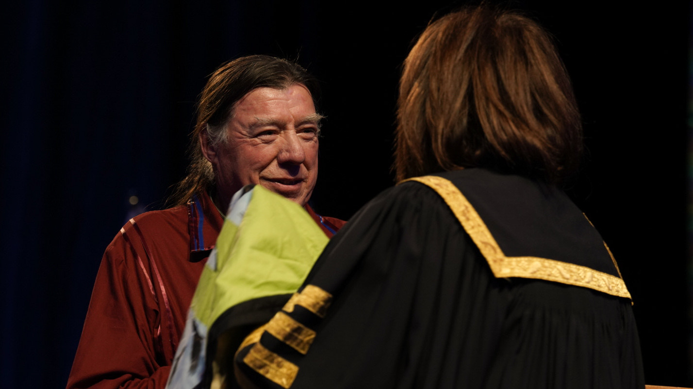 Kerry Prosper, StFX Elder on Campus, brought greetings, congratulating Dr. Mulroney on her appointment as chancellor, and honoured her with the gift of a star blanket. “It holds special significance,” he said. “It is used in one of the highest forms of prayer.”