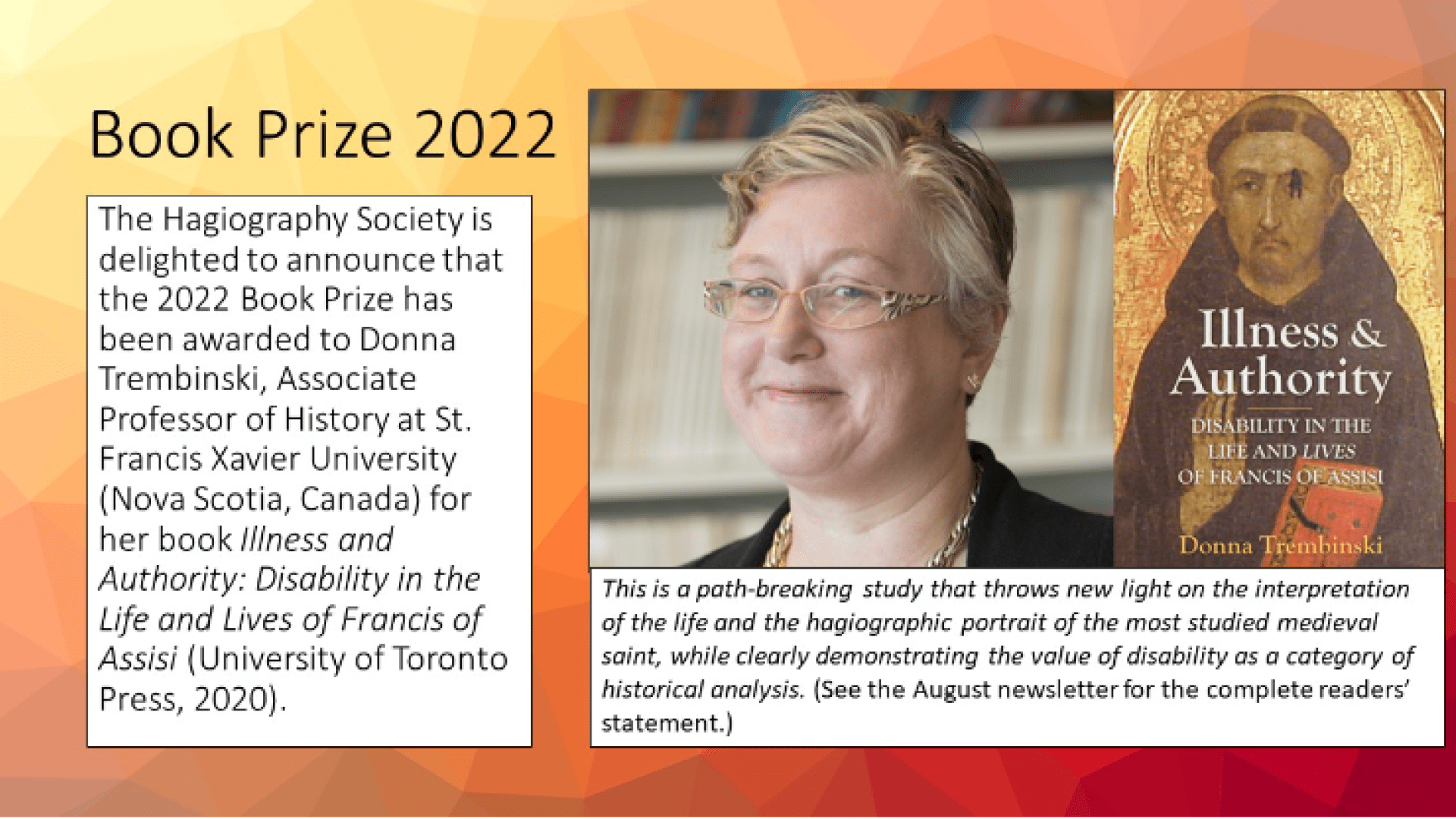 The Hagiography Society is delighted to announce that the 2022 Book Prize has been awarded to Donna Trembinski, Associate Professor of History at St. Francis Xavier University (Nova Scotia, Canada) for her book Illness and Authority: Disability in the Life and Lives of Francis of Assisi (University of Toronto Press, 2020).