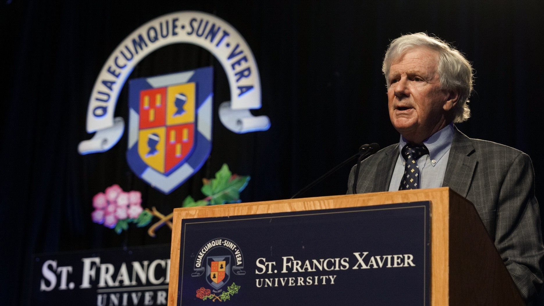 Further words of inspiration were shared by fourth-year Public Policy and Governance student Rory Jakubec, who read from the writings of Rev. Dr. Moses Coady. “Staying within the present framework is a smug philosophy,” said the great pioneer of the Antigonish Movement and namesake of StFX’s Coady Institute. He urged learners to challenge the status quo and champion the cause of social and economic justice.