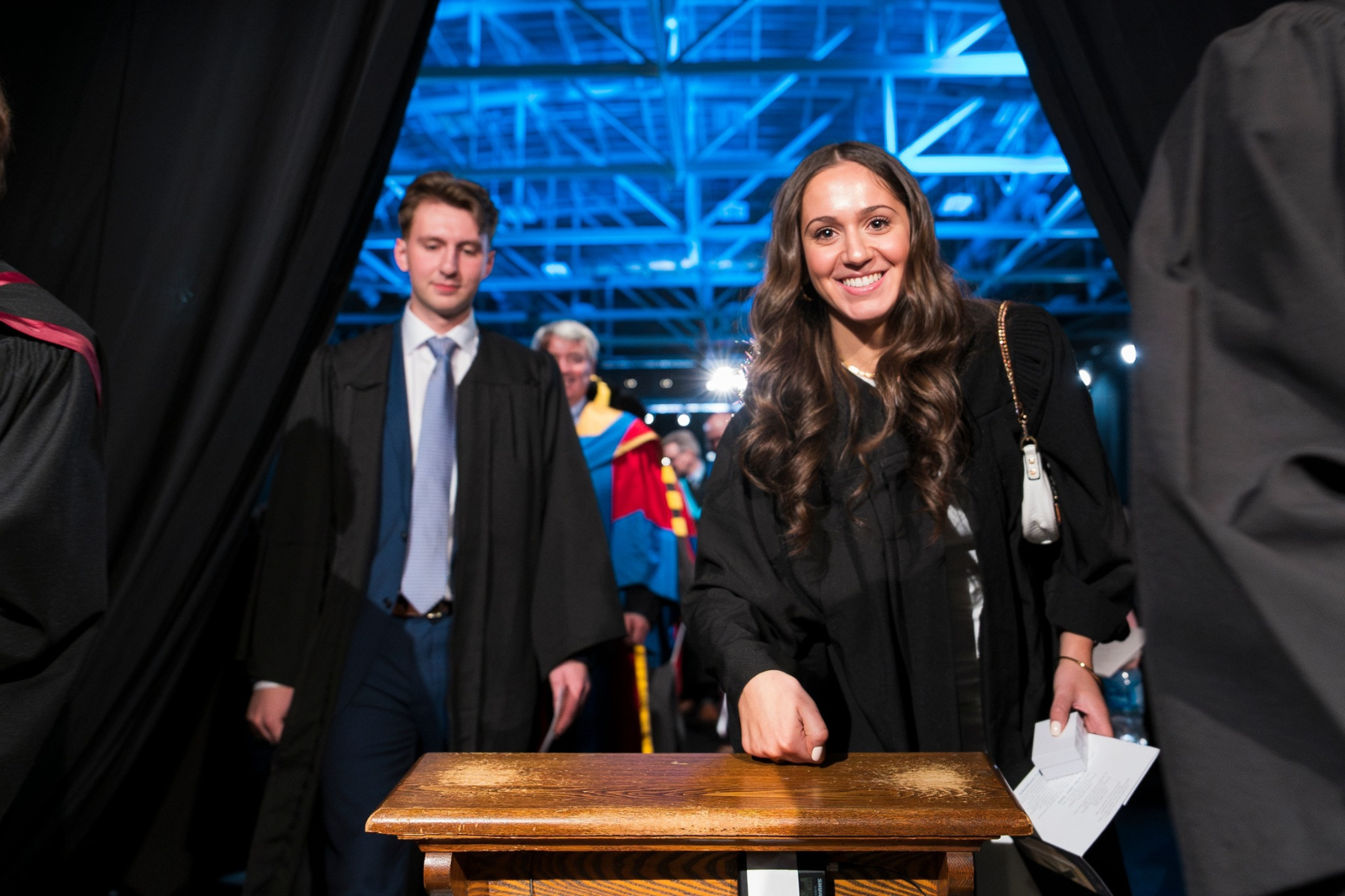 Dr. Hakin’s address was followed by remarks from Brett Baxter, Co-President of the StFX Senior Class. He talked about the special memories and friendships formed during one’s time at StFX. A New Brunswicker, he said he met “some of the kindest people in the world” in Antigonish and that he and his peers “will call this place our second home for life.”