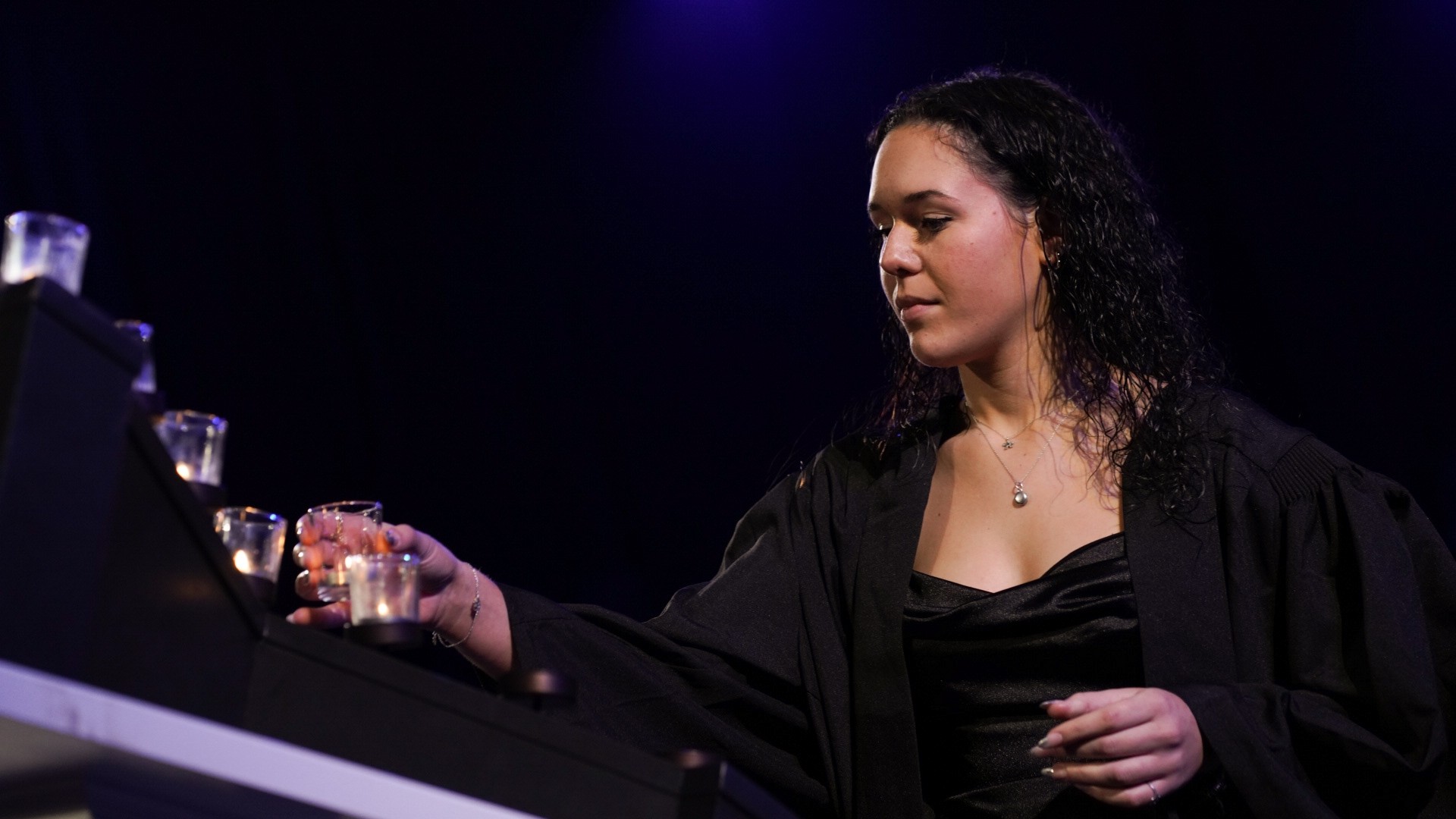 Radiating with excitement, gown-clad students were piped into the blue-lit room. Master of Ceremonies Vincent Breen, Co-President of the Senior Class, opened the ceremony by inviting fellow students to the stage for the lighting of the X Candle.