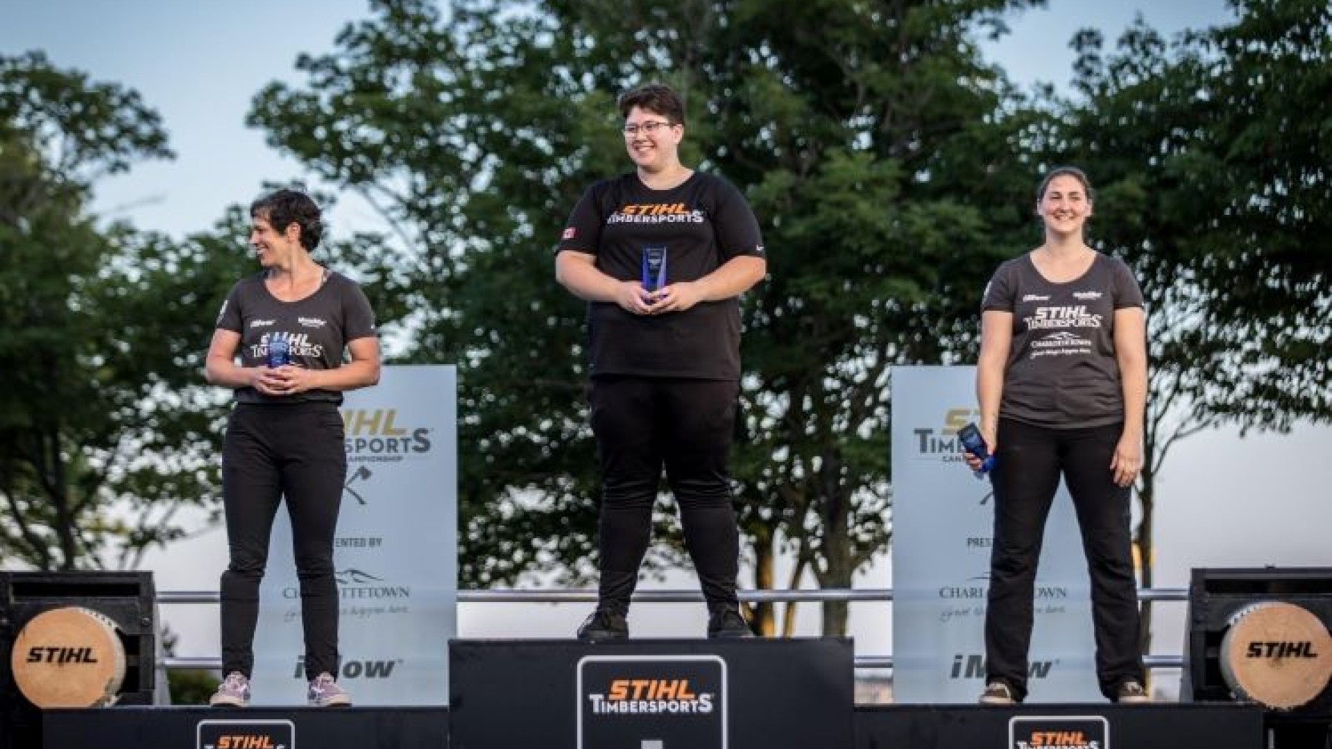StFX student Ally Briscoe (centre) was crowned Canadian women's champion and will represent the country at the world STIHL TIMBERSPORTS championship in Europe. (Photo: Mykhail Baehr)
