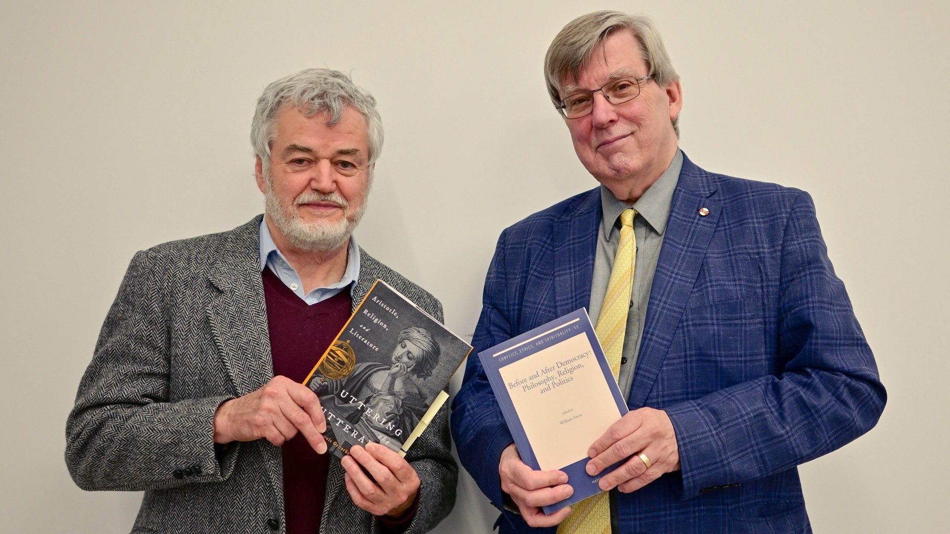 The event featured the official presentation of the Fr. Charles R. MacDonald Memorial Medal in Philosophy to recent graduate Ken Matheson (BA 2023) and the launch of two books by Philosophy Department faculty members, Professor Louis Groarke (Uttering the Unutterable: Aristotle, Religion, and Literature) and Professor William Sweet (Before and After Democracy: Philosophy, Religion, and Politics).