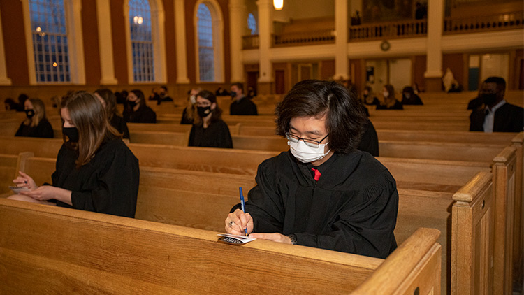Senior students—soon-to-be-graduates clad in black robes—took time to celebrate the spirit of community, to reflect on their journey at StFX so far, and to recommit to the pursuit of excellence as members of the Class of 2021 gathered at venues across campus on March 28 to participate in the Xaverian Farewell Ceremony.