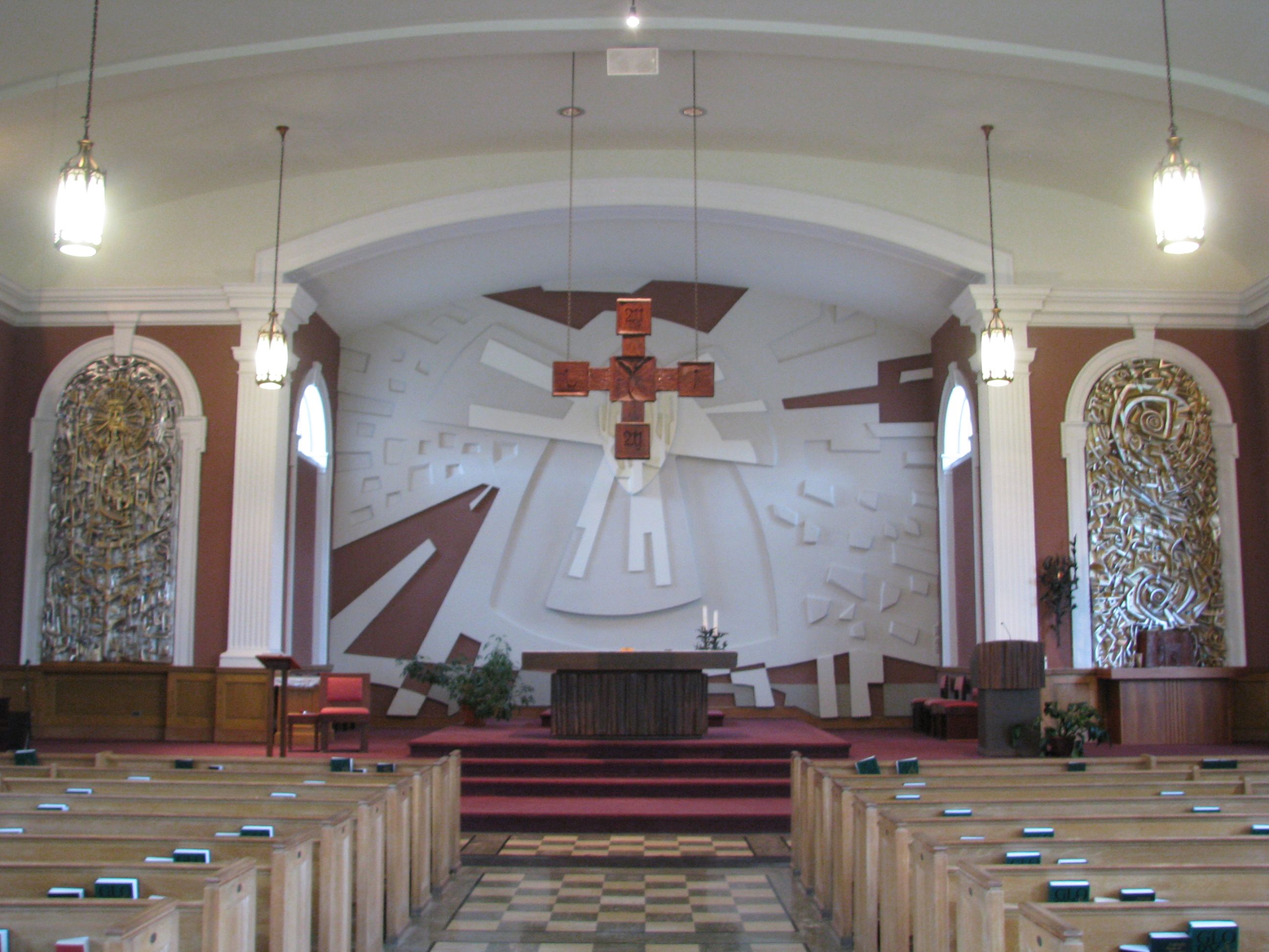 Earl Neiman was a man of his age. Although he was a great draughtsman and could paint like Rubens, he was fascinated by new materials and influenced by the incentive spirit of the times. In 1954 Dow Chemical introduced a foamed polystyrene by the trademark name Styrofoam. Earl was one of the first to see its possibilities as an art medium on both interior and exterior surfaces. He used this material on the mural and two sides panels in the Chapel. In the main mural he wanted to approximate the surface texture similar to that of the stucco walls. He achieved this rough surface by choosing a good quality, latex house paint and mixing in fine-sand patching cement (quick drying) so that the mixture could be brushed easily or toweled.