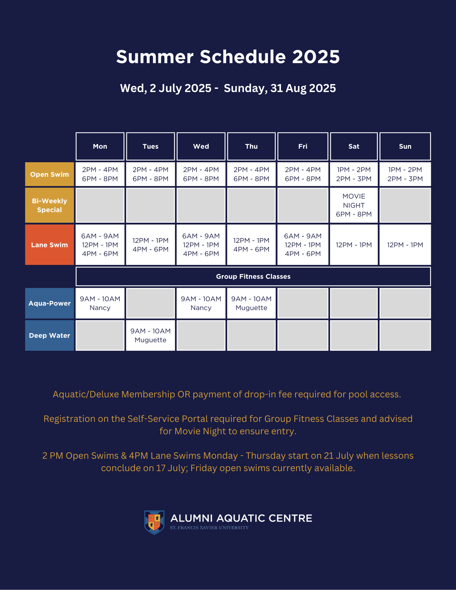 The Alumni Aquatic Centre is a 25-metre, six-lane swimming pool, located in the Amelia Saputo Centre at StFX. The facility is open to both the StFX and Antigonish community members. We offer a variety of Membership & Drop-In options to meet your aquatic needs.