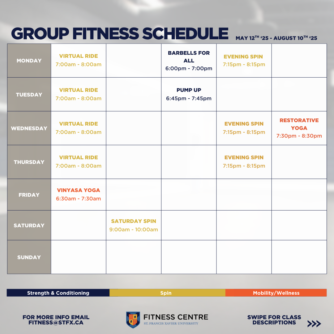 The StFX Fitness Centre offers drop-in group fitness classes such as HIIT circuits, spin classes, yoga, and more. Drop-in group fitness classes are included in your Fitness Centre membership.