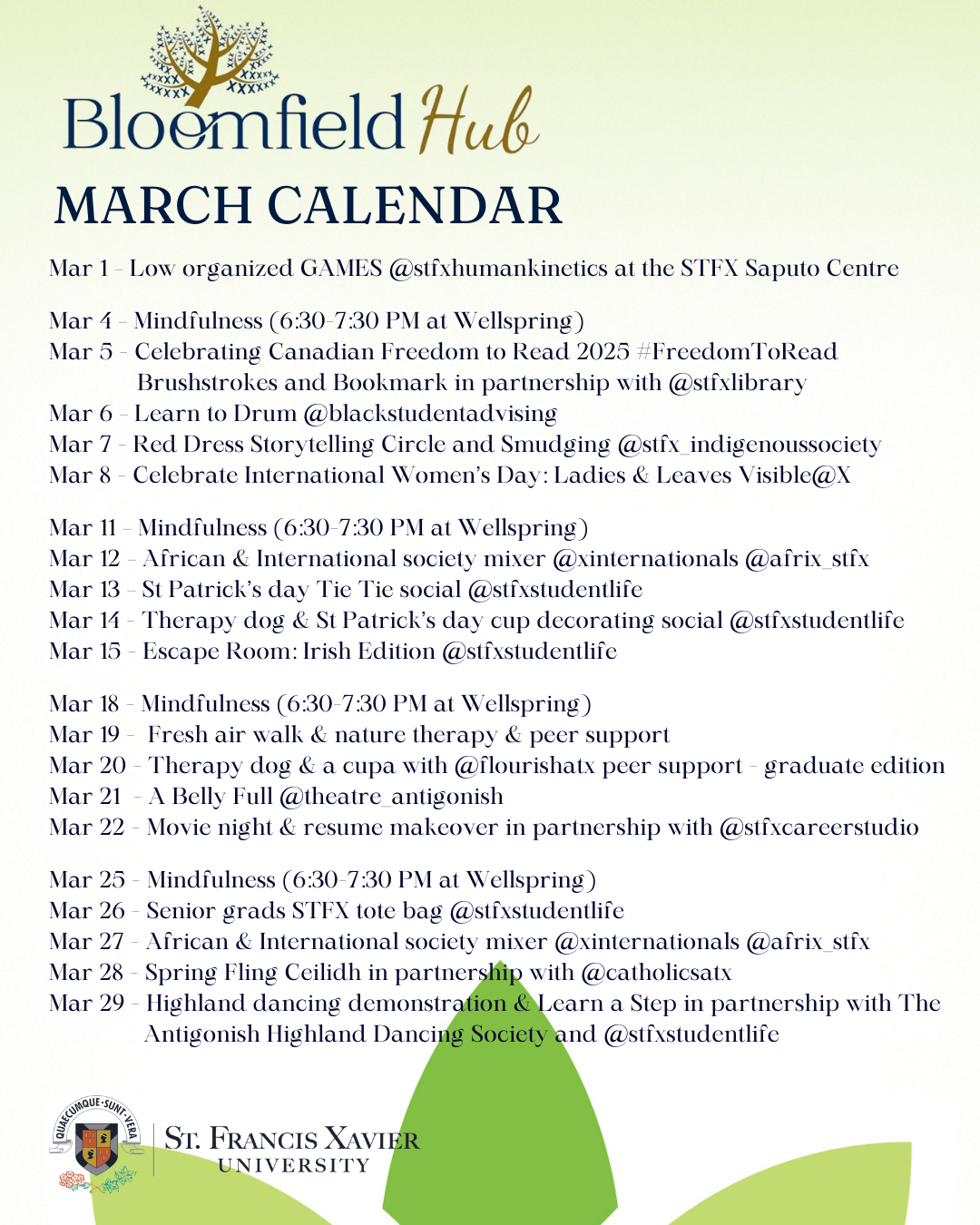 | September 25 | 7pm-9pm | Music, Mocktails & Harm Reduction lids with StFX Wellness Champion Renee Hobbs, Visible@X, & @Studentlife |
